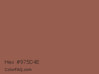 Hex #975d4e Color is a normal red color and the nearest color is Spicy Mix #8b5f4d. Hex code #975d4e and RGB value is rgb(151,93,78). In RGB color space, this color is composed of 59% red, 36% green, 31% blue, In CMYK color space, this color is composed of 0% cyan, 38% magenta, 48% yellow , 41% black , In HSL color space, this color has a hue angle of 12° , 32% saturation and 45% lightness.