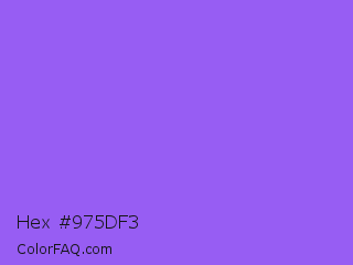 Hex #975df3 Color is a light violet color and the nearest color is Navy Purple #9457eb. Hex code #975df3 and RGB value is rgb(151,93,243). In RGB color space, this color is composed of 59% red, 36% green, 95% blue, In CMYK color space, this color is composed of 38% cyan, 62% magenta, 0% yellow , 5% black , In HSL color space, this color has a hue angle of 263° , 86% saturation and 66% lightness.