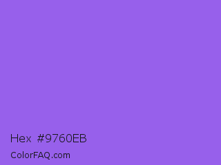 Hex #9760eb Color is a light violet color and the nearest color is Navy Purple #9457eb. Hex code #9760eb and RGB value is rgb(151,96,235). In RGB color space, this color is composed of 59% red, 38% green, 92% blue, In CMYK color space, this color is composed of 36% cyan, 59% magenta, 0% yellow , 8% black , In HSL color space, this color has a hue angle of 264° , 78% saturation and 65% lightness.