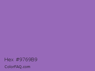 Hex #9769b9 Color is a normal purple color and the nearest color is Wisteria #9771b5. Hex code #9769b9 and RGB value is rgb(151,105,185). In RGB color space, this color is composed of 59% red, 41% green, 73% blue, In CMYK color space, this color is composed of 18% cyan, 43% magenta, 0% yellow , 27% black , In HSL color space, this color has a hue angle of 275° , 36% saturation and 57% lightness.