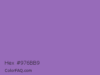 Hex #976bb9 Color is a normal purple color and the nearest color is Wisteria #9771b5. Hex code #976bb9 and RGB value is rgb(151,107,185). In RGB color space, this color is composed of 59% red, 42% green, 73% blue, In CMYK color space, this color is composed of 18% cyan, 42% magenta, 0% yellow , 27% black , In HSL color space, this color has a hue angle of 274° , 36% saturation and 57% lightness.