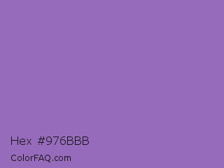Hex #976bbb Color is a normal purple color and the nearest color is Wisteria #9771b5. Hex code #976bbb and RGB value is rgb(151,107,187). In RGB color space, this color is composed of 59% red, 42% green, 73% blue, In CMYK color space, this color is composed of 19% cyan, 43% magenta, 0% yellow , 27% black , In HSL color space, this color has a hue angle of 273° , 37% saturation and 58% lightness.