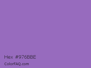 Hex #976bbe Color is a normal purple color and the nearest color is Wisteria #9771b5. Hex code #976bbe and RGB value is rgb(151,107,190). In RGB color space, this color is composed of 59% red, 42% green, 75% blue, In CMYK color space, this color is composed of 21% cyan, 44% magenta, 0% yellow , 25% black , In HSL color space, this color has a hue angle of 272° , 39% saturation and 58% lightness.