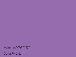 Hex #976db2 Color is a normal purple color and the nearest color is Wisteria #9771b5. Hex code #976db2 and RGB value is rgb(151,109,178). In RGB color space, this color is composed of 59% red, 43% green, 70% blue, In CMYK color space, this color is composed of 15% cyan, 39% magenta, 0% yellow , 30% black , In HSL color space, this color has a hue angle of 277° , 31% saturation and 56% lightness.