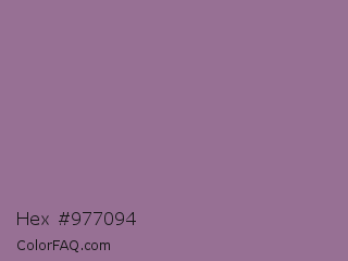 Hex #977094 Color is a normal magenta color and the nearest color is Mountbatten Pink #997a8d. Hex code #977094 and RGB value is rgb(151,112,148). In RGB color space, this color is composed of 59% red, 44% green, 58% blue, In CMYK color space, this color is composed of 0% cyan, 26% magenta, 2% yellow , 41% black , In HSL color space, this color has a hue angle of 305° , 16% saturation and 52% lightness.