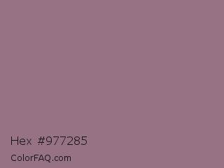 Hex #977285 Color is a normal rose color and the nearest color is Bazaar #98777b. Hex code #977285 and RGB value is rgb(151,114,133). In RGB color space, this color is composed of 59% red, 45% green, 52% blue, In CMYK color space, this color is composed of 0% cyan, 25% magenta, 12% yellow , 41% black , In HSL color space, this color has a hue angle of 329° , 15% saturation and 52% lightness.