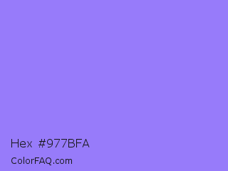 Hex #977bfa Color is a light indigo color and the nearest color is Medium Purple #9370db. Hex code #977bfa and RGB value is rgb(151,123,250). In RGB color space, this color is composed of 59% red, 48% green, 98% blue, In CMYK color space, this color is composed of 40% cyan, 51% magenta, 0% yellow , 2% black , In HSL color space, this color has a hue angle of 253° , 93% saturation and 73% lightness.