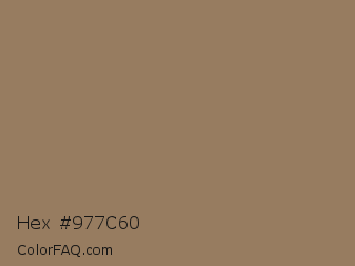 Hex #977c60 Color is a normal orange color and the nearest color is Domino #8e775e. Hex code #977c60 and RGB value is rgb(151,124,96). In RGB color space, this color is composed of 59% red, 49% green, 38% blue, In CMYK color space, this color is composed of 0% cyan, 18% magenta, 36% yellow , 41% black , In HSL color space, this color has a hue angle of 31° , 22% saturation and 48% lightness.