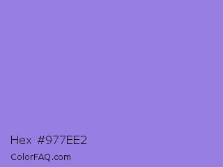 Hex #977ee2 Color is a light indigo color and the nearest color is Medium Purple #9370db. Hex code #977ee2 and RGB value is rgb(151,126,226). In RGB color space, this color is composed of 59% red, 49% green, 89% blue, In CMYK color space, this color is composed of 33% cyan, 44% magenta, 0% yellow , 11% black , In HSL color space, this color has a hue angle of 255° , 63% saturation and 69% lightness.