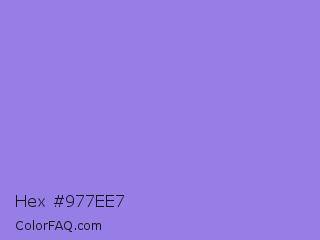 Hex #977ee7 Color is a light indigo color and the nearest color is Medium Purple #9370db. Hex code #977ee7 and RGB value is rgb(151,126,231). In RGB color space, this color is composed of 59% red, 49% green, 91% blue, In CMYK color space, this color is composed of 35% cyan, 45% magenta, 0% yellow , 9% black , In HSL color space, this color has a hue angle of 254° , 69% saturation and 70% lightness.