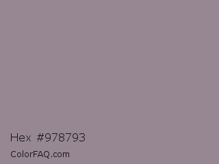 Hex #978793 Color is a normal magenta color and the nearest color is Venus #928590. Hex code #978793 and RGB value is rgb(151,135,147). In RGB color space, this color is composed of 59% red, 53% green, 58% blue, In CMYK color space, this color is composed of 0% cyan, 11% magenta, 3% yellow , 41% black , In HSL color space, this color has a hue angle of 315° , 7% saturation and 56% lightness.