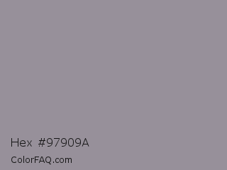 Hex #97909a Color is a normal purple color and the nearest color is Mountain Mist #959396. Hex code #97909a and RGB value is rgb(151,144,154). In RGB color space, this color is composed of 59% red, 56% green, 60% blue, In CMYK color space, this color is composed of 2% cyan, 6% magenta, 0% yellow , 40% black , In HSL color space, this color has a hue angle of 282° , 5% saturation and 58% lightness.