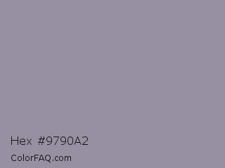 Hex #9790a2 Color is a normal violet color and the nearest color is Manatee Crayola #8d90a1. Hex code #9790a2 and RGB value is rgb(151,144,162). In RGB color space, this color is composed of 59% red, 56% green, 64% blue, In CMYK color space, this color is composed of 7% cyan, 11% magenta, 0% yellow , 36% black , In HSL color space, this color has a hue angle of 263° , 9% saturation and 60% lightness.