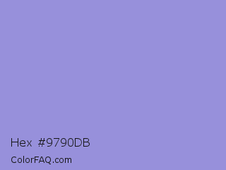 Hex #9790db Color is a light indigo color and the nearest color is Blue Bell Crayola #9999cc. Hex code #9790db and RGB value is rgb(151,144,219). In RGB color space, this color is composed of 59% red, 56% green, 86% blue, In CMYK color space, this color is composed of 31% cyan, 34% magenta, 0% yellow , 14% black , In HSL color space, this color has a hue angle of 246° , 51% saturation and 71% lightness.
