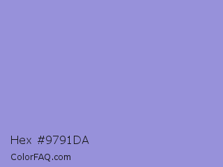 Hex #9791da Color is a light indigo color and the nearest color is Blue Bell Crayola #9999cc. Hex code #9791da and RGB value is rgb(151,145,218). In RGB color space, this color is composed of 59% red, 57% green, 85% blue, In CMYK color space, this color is composed of 31% cyan, 33% magenta, 0% yellow , 15% black , In HSL color space, this color has a hue angle of 245° , 50% saturation and 71% lightness.