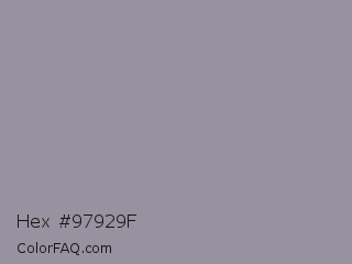 Hex #97929f Color is a normal violet color and the nearest color is Mountain Mist #959396. Hex code #97929f and RGB value is rgb(151,146,159). In RGB color space, this color is composed of 59% red, 57% green, 62% blue, In CMYK color space, this color is composed of 5% cyan, 8% magenta, 0% yellow , 38% black , In HSL color space, this color has a hue angle of 263° , 6% saturation and 60% lightness.