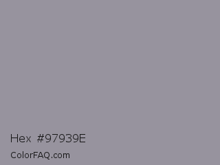 Hex #97939e Color is a normal violet color and the nearest color is Spanish Gray #989898. Hex code #97939e and RGB value is rgb(151,147,158). In RGB color space, this color is composed of 59% red, 58% green, 62% blue, In CMYK color space, this color is composed of 4% cyan, 7% magenta, 0% yellow , 38% black , In HSL color space, this color has a hue angle of 262° , 5% saturation and 60% lightness.