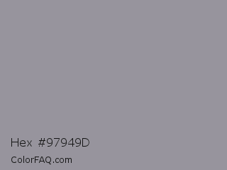 Hex #97949d Color is a normal indigo color and the nearest color is Spanish Gray #989898. Hex code #97949d and RGB value is rgb(151,148,157). In RGB color space, this color is composed of 59% red, 58% green, 62% blue, In CMYK color space, this color is composed of 4% cyan, 6% magenta, 0% yellow , 38% black , In HSL color space, this color has a hue angle of 260° , 4% saturation and 60% lightness.