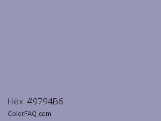 Hex #9794b6 Color is a light indigo color and the nearest color is Amethyst Smoke #a397b4. Hex code #9794b6 and RGB value is rgb(151,148,182). In RGB color space, this color is composed of 59% red, 58% green, 71% blue, In CMYK color space, this color is composed of 17% cyan, 19% magenta, 0% yellow , 29% black , In HSL color space, this color has a hue angle of 245° , 19% saturation and 65% lightness.
