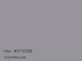 Hex #97959b Color is a normal indigo color and the nearest color is Spanish Gray #989898. Hex code #97959b and RGB value is rgb(151,149,155). In RGB color space, this color is composed of 59% red, 58% green, 61% blue, In CMYK color space, this color is composed of 3% cyan, 4% magenta, 0% yellow , 39% black , In HSL color space, this color has a hue angle of 260° , 3% saturation and 60% lightness.