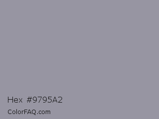 Hex #9795a2 Color is a light indigo color and the nearest color is Manatee #979aaa. Hex code #9795a2 and RGB value is rgb(151,149,162). In RGB color space, this color is composed of 59% red, 58% green, 64% blue, In CMYK color space, this color is composed of 7% cyan, 8% magenta, 0% yellow , 36% black , In HSL color space, this color has a hue angle of 249° , 7% saturation and 61% lightness.