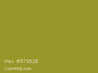 Hex #979628 Color is a normal yellow color and the nearest color is Sycamore #908d39. Hex code #979628 and RGB value is rgb(151,150,40). In RGB color space, this color is composed of 59% red, 59% green, 16% blue, In CMYK color space, this color is composed of 0% cyan, 1% magenta, 74% yellow , 41% black , In HSL color space, this color has a hue angle of 59° , 58% saturation and 37% lightness.