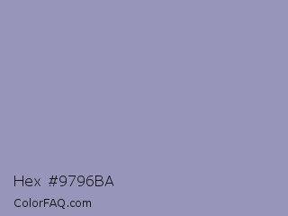 Hex #9796ba Color is a light indigo color and the nearest color is Amethyst Smoke #a397b4. Hex code #9796ba and RGB value is rgb(151,150,186). In RGB color space, this color is composed of 59% red, 59% green, 73% blue, In CMYK color space, this color is composed of 19% cyan, 19% magenta, 0% yellow , 27% black , In HSL color space, this color has a hue angle of 242° , 21% saturation and 66% lightness.