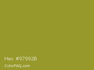 Hex #97992b Color is a normal yellow color and the nearest color is Sycamore #908d39. Hex code #97992b and RGB value is rgb(151,153,43). In RGB color space, this color is composed of 59% red, 60% green, 17% blue, In CMYK color space, this color is composed of 1% cyan, 0% magenta, 72% yellow , 40% black , In HSL color space, this color has a hue angle of 61° , 56% saturation and 38% lightness.