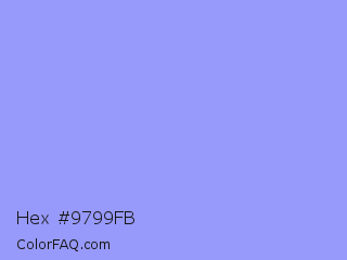 Hex #9799fb Color is a light blue color and the nearest color is Portage #8b9fee. Hex code #9799fb and RGB value is rgb(151,153,251). In RGB color space, this color is composed of 59% red, 60% green, 98% blue, In CMYK color space, this color is composed of 40% cyan, 39% magenta, 0% yellow , 2% black , In HSL color space, this color has a hue angle of 239° , 93% saturation and 79% lightness.