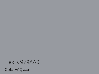 Hex #979aa0 Color is a light blue color and the nearest color is Spanish Gray #989898. Hex code #979aa0 and RGB value is rgb(151,154,160). In RGB color space, this color is composed of 59% red, 60% green, 63% blue, In CMYK color space, this color is composed of 6% cyan, 4% magenta, 0% yellow , 37% black , In HSL color space, this color has a hue angle of 220° , 5% saturation and 61% lightness.