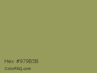 Hex #979b5b Color is a normal yellow color and the nearest color is Moss Green #8a9a5b. Hex code #979b5b and RGB value is rgb(151,155,91). In RGB color space, this color is composed of 59% red, 61% green, 36% blue, In CMYK color space, this color is composed of 3% cyan, 0% magenta, 41% yellow , 39% black , In HSL color space, this color has a hue angle of 64° , 26% saturation and 48% lightness.