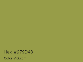 Hex #979d48 Color is a normal yellow color and the nearest color is Sycamore #908d39. Hex code #979d48 and RGB value is rgb(151,157,72). In RGB color space, this color is composed of 59% red, 62% green, 28% blue, In CMYK color space, this color is composed of 4% cyan, 0% magenta, 54% yellow , 38% black , In HSL color space, this color has a hue angle of 64° , 37% saturation and 45% lightness.
