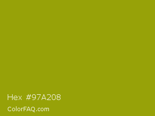 Hex #97a208 Color is a normal yellow color and the nearest color is Apple Green #8db600. Hex code #97a208 and RGB value is rgb(151,162,8). In RGB color space, this color is composed of 59% red, 64% green, 3% blue, In CMYK color space, this color is composed of 7% cyan, 0% magenta, 95% yellow , 36% black , In HSL color space, this color has a hue angle of 64° , 91% saturation and 33% lightness.