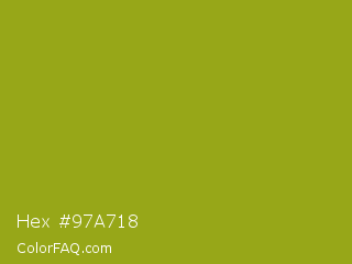 Hex #97a718 Color is a normal yellow color and the nearest color is Citron #9fa91f. Hex code #97a718 and RGB value is rgb(151,167,24). In RGB color space, this color is composed of 59% red, 65% green, 9% blue, In CMYK color space, this color is composed of 10% cyan, 0% magenta, 86% yellow , 35% black , In HSL color space, this color has a hue angle of 67° , 75% saturation and 37% lightness.