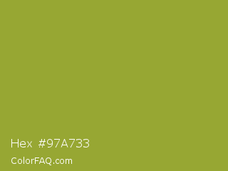 Hex #97a733 Color is a normal yellow color and the nearest color is Sushi #87ab39. Hex code #97a733 and RGB value is rgb(151,167,51). In RGB color space, this color is composed of 59% red, 65% green, 20% blue, In CMYK color space, this color is composed of 10% cyan, 0% magenta, 69% yellow , 35% black , In HSL color space, this color has a hue angle of 68° , 53% saturation and 43% lightness.