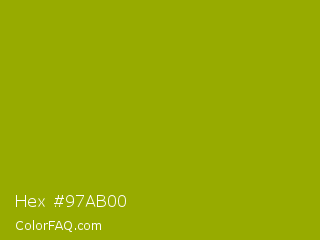 Hex #97ab00 Color is a normal yellow color and the nearest color is Apple Green #8db600. Hex code #97ab00 and RGB value is rgb(151,171,0). In RGB color space, this color is composed of 59% red, 67% green, 0% blue, In CMYK color space, this color is composed of 12% cyan, 0% magenta, 100% yellow , 33% black , In HSL color space, this color has a hue angle of 67° , 100% saturation and 34% lightness.