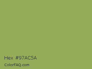 Hex #97ac5a Color is a normal lime color and the nearest color is Chelsea Cucumber #83aa5d. Hex code #97ac5a and RGB value is rgb(151,172,90). In RGB color space, this color is composed of 59% red, 67% green, 35% blue, In CMYK color space, this color is composed of 12% cyan, 0% magenta, 48% yellow , 33% black , In HSL color space, this color has a hue angle of 75° , 33% saturation and 51% lightness.