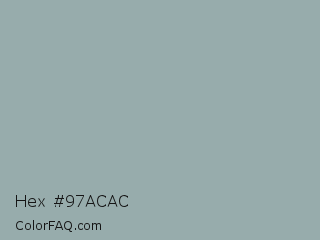 Hex #97acac Color is a light cyan color and the nearest color is Edward #a2aeab. Hex code #97acac and RGB value is rgb(151,172,172). In RGB color space, this color is composed of 59% red, 67% green, 67% blue, In CMYK color space, this color is composed of 12% cyan, 0% magenta, 0% yellow , 33% black , In HSL color space, this color has a hue angle of 180° , 11% saturation and 63% lightness.