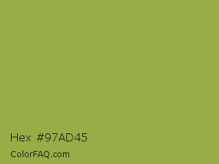Hex #97ad45 Color is a normal lime color and the nearest color is Sushi #87ab39. Hex code #97ad45 and RGB value is rgb(151,173,69). In RGB color space, this color is composed of 59% red, 68% green, 27% blue, In CMYK color space, this color is composed of 13% cyan, 0% magenta, 60% yellow , 32% black , In HSL color space, this color has a hue angle of 73° , 43% saturation and 47% lightness.