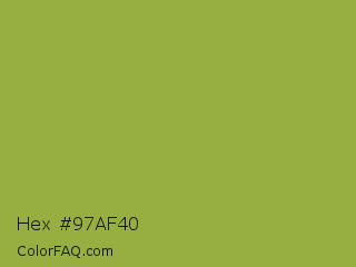 Hex #97af40 Color is a normal lime color and the nearest color is Sushi #87ab39. Hex code #97af40 and RGB value is rgb(151,175,64). In RGB color space, this color is composed of 59% red, 69% green, 25% blue, In CMYK color space, this color is composed of 14% cyan, 0% magenta, 63% yellow , 31% black , In HSL color space, this color has a hue angle of 73° , 46% saturation and 47% lightness.