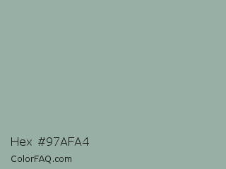Hex #97afa4 Color is a light green color and the nearest color is Pewter #96a8a1. Hex code #97afa4 and RGB value is rgb(151,175,164). In RGB color space, this color is composed of 59% red, 69% green, 64% blue, In CMYK color space, this color is composed of 14% cyan, 0% magenta, 6% yellow , 31% black , In HSL color space, this color has a hue angle of 153° , 13% saturation and 64% lightness.