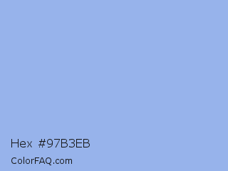 Hex #97b3eb Color is a light blue color and the nearest color is Jordy Blue #8ab9f1. Hex code #97b3eb and RGB value is rgb(151,179,235). In RGB color space, this color is composed of 59% red, 70% green, 92% blue, In CMYK color space, this color is composed of 36% cyan, 24% magenta, 0% yellow , 8% black , In HSL color space, this color has a hue angle of 220° , 68% saturation and 76% lightness.