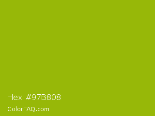 Hex #97b808 Color is a normal lime color and the nearest color is Pistachio Green #9dc209. Hex code #97b808 and RGB value is rgb(151,184,8). In RGB color space, this color is composed of 59% red, 72% green, 3% blue, In CMYK color space, this color is composed of 18% cyan, 0% magenta, 96% yellow , 28% black , In HSL color space, this color has a hue angle of 71° , 92% saturation and 38% lightness.