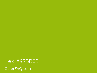 Hex #97bb0b Color is a normal lime color and the nearest color is Pistachio Green #9dc209. Hex code #97bb0b and RGB value is rgb(151,187,11). In RGB color space, this color is composed of 59% red, 73% green, 4% blue, In CMYK color space, this color is composed of 19% cyan, 0% magenta, 94% yellow , 27% black , In HSL color space, this color has a hue angle of 72° , 89% saturation and 39% lightness.