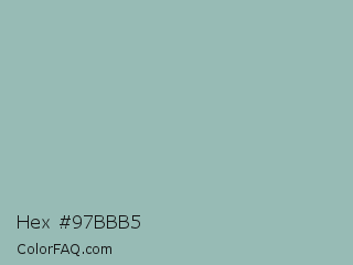 Hex #97bbb5 Color is a light cyan color and the nearest color is Shadow Green #9ac2b8. Hex code #97bbb5 and RGB value is rgb(151,187,181). In RGB color space, this color is composed of 59% red, 73% green, 71% blue, In CMYK color space, this color is composed of 19% cyan, 0% magenta, 3% yellow , 27% black , In HSL color space, this color has a hue angle of 170° , 21% saturation and 66% lightness.