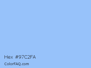 Hex #97c2fa Color is a light blue color and the nearest color is Baby Blue Eyes #a1caf1. Hex code #97c2fa and RGB value is rgb(151,194,250). In RGB color space, this color is composed of 59% red, 76% green, 98% blue, In CMYK color space, this color is composed of 40% cyan, 22% magenta, 0% yellow , 2% black , In HSL color space, this color has a hue angle of 214° , 91% saturation and 79% lightness.