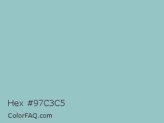 Hex #97c3c5 Color is a light cyan color and the nearest color is Shadow Green #9ac2b8. Hex code #97c3c5 and RGB value is rgb(151,195,197). In RGB color space, this color is composed of 59% red, 76% green, 77% blue, In CMYK color space, this color is composed of 23% cyan, 1% magenta, 0% yellow , 23% black , In HSL color space, this color has a hue angle of 183° , 28% saturation and 68% lightness.