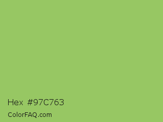 Hex #97c763 Color is a normal green color and the nearest color is Pistachio #93c572. Hex code #97c763 and RGB value is rgb(151,199,99). In RGB color space, this color is composed of 59% red, 78% green, 39% blue, In CMYK color space, this color is composed of 24% cyan, 0% magenta, 50% yellow , 22% black , In HSL color space, this color has a hue angle of 89° , 47% saturation and 58% lightness.