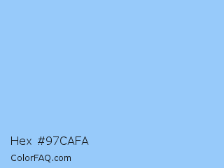 Hex #97cafa Color is a light blue color and the nearest color is Baby Blue Eyes #a1caf1. Hex code #97cafa and RGB value is rgb(151,202,250). In RGB color space, this color is composed of 59% red, 79% green, 98% blue, In CMYK color space, this color is composed of 40% cyan, 19% magenta, 0% yellow , 2% black , In HSL color space, this color has a hue angle of 209° , 91% saturation and 79% lightness.