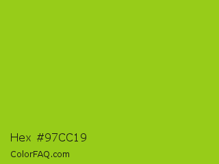 Hex #97cc19 Color is a normal lime color and the nearest color is Bahia #a5cb0c. Hex code #97cc19 and RGB value is rgb(151,204,25). In RGB color space, this color is composed of 59% red, 80% green, 10% blue, In CMYK color space, this color is composed of 26% cyan, 0% magenta, 88% yellow , 20% black , In HSL color space, this color has a hue angle of 78° , 78% saturation and 45% lightness.